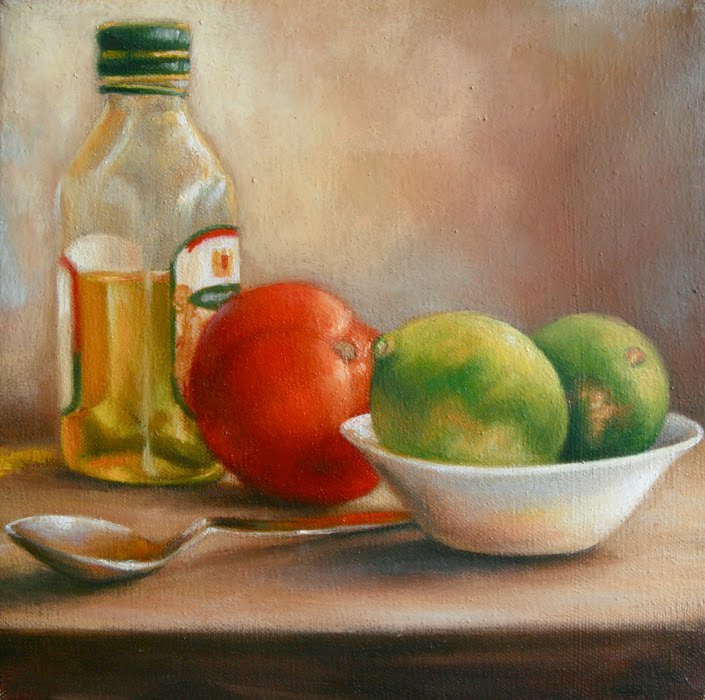 Olive Oil with Tomato and Limes, 2005, oil on canvas, 10 x 10 inches
